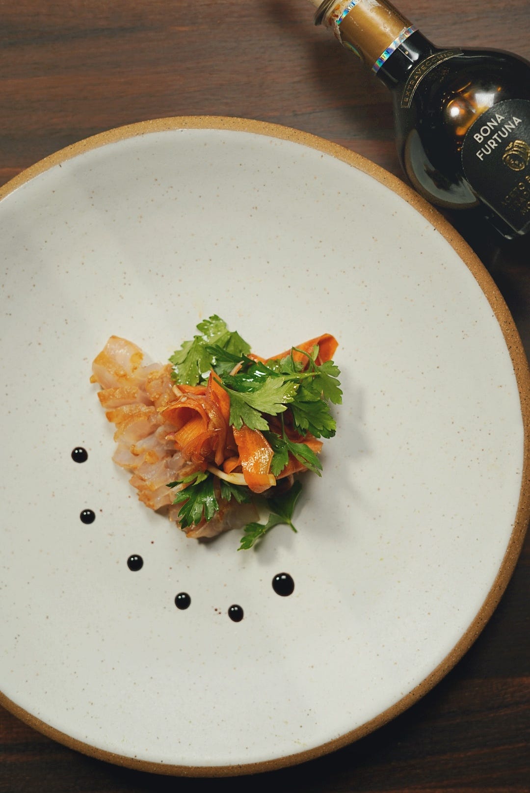 Clean, cold slices of snapper cured in aged balsamic, finished with crisp vegetables and three layers of brightness from Bona Furtuna.