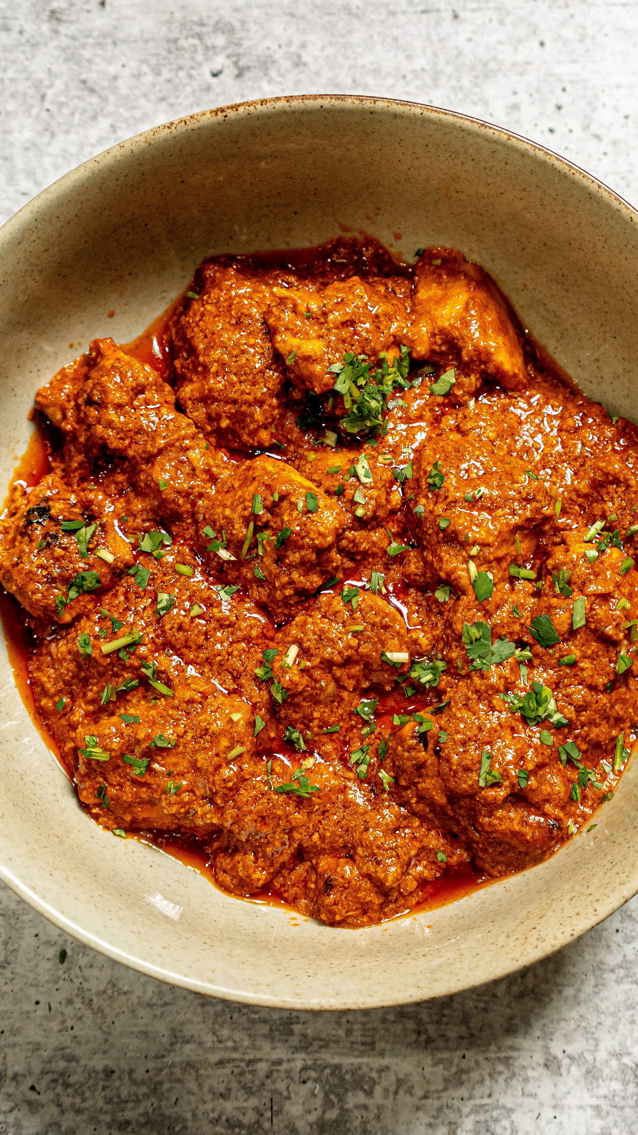 Tender marinated chicken thighs roasted, then finished in a spiced tomato-butter sauce enriched with crème fraîche. Balanced heat, deep flavor, and a glossy finish that clings to every bite.