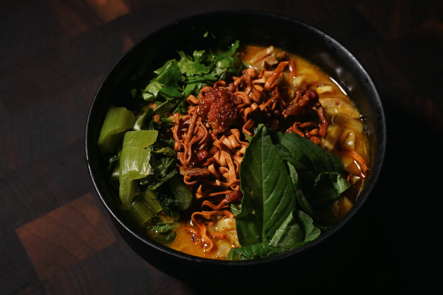 A Northern Thai curry noodle soup built from a hand-pounded paste, coconut broth, and tender chicken — finished with pickled greens, fresh herbs, and crispy noodles.